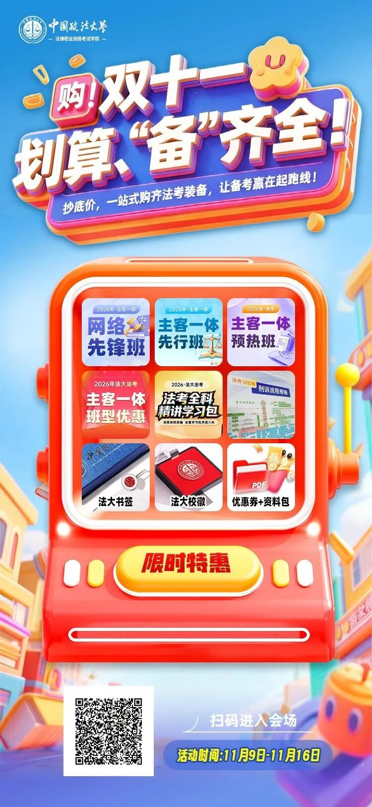 中国政法大学法律职业资格考试学院推出“双十一法学装备专场”,帮你一站式购齐所有备考所需,划算“备”齐全!